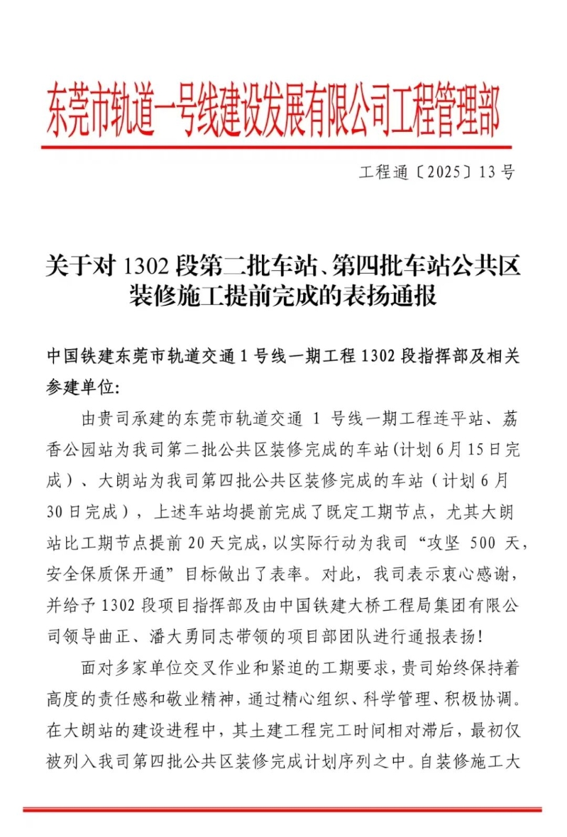 近日,東莞地鐵1號線指揮部收到東莞市軌道一號線建設發展有限公司發來的表揚通報。通報對東莞地鐵1號線1302段連平站、荔香公園站、大朗站提前完成既定工期節點表示肯定,特別是大朗站較原定節點提前20天完成,大幅提前實現關鍵目標,以實際行動為保障全線開通作出了表率。